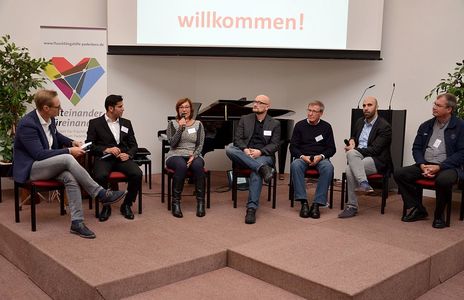 In einer weiteren Talkrunde mit Ahmad Mansour, Pastor Meinolf Wacker aus Kamen, Paul Esken von der Caritas-Konferenz Hl. Kreuz in Arnsberg, Markus Groß von IN VIA Paderborn, Bettina Bielefeld vom Projekt „Ankommen“ in Dortmund sowie dem aus Syrien geflüchteten Omar Alfarhan berichtete Meinolf Wacker von der positiven Entwicklung der Flüchtlingshilfe in Kamen. „Wir wollen den Flüchtlingen einen Boden bereiten auf dem sie stehen können“, sagte Pastor Wacker. Für den jungen Syrer Omar Alfarhan aus Dortmund besteht dieser Boden derzeit aus einem kaufmännischen Praktikum und der Aussicht auf eine Ausbildung zum Bürokaufmann.