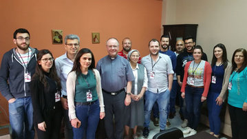 Mit zahlreichen Helfern u. a. des „Christian Hope Center“ in Aleppo unterstützt Sr. Annie Demerjian (Mitte) bedürftige Menschen in Aleppo und anderen Orten Syriens. Das Foto entstand im April bei einem Besuch von Domkapitular Dr. Thomas Witt, Vorsitzender des Diözesan-Caritasverbandes (5. v. l.), und Hezni Barjosef (3. v. l.), Flüchtlingskoordinator im Erzbistum Paderborn. (Fotos: cpd / Christian Hope Center Aleppo)